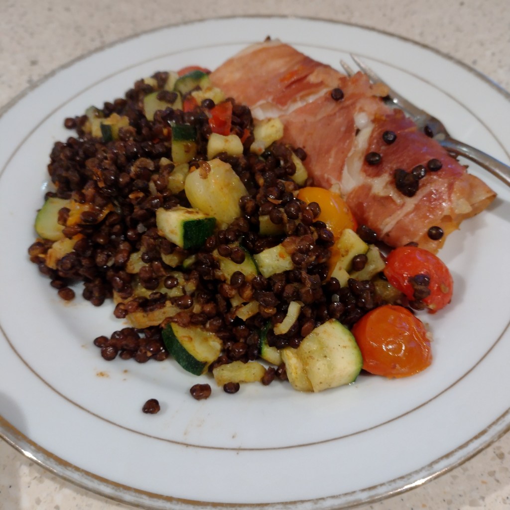 Cod loin wrapped in prosciutto, diced courgette, cherry tomatoes and garlic and puy lentils all pan fried. It was rather yummy. The lentils have a sort of baked bean texture rather than the mushy texture of red lentils.