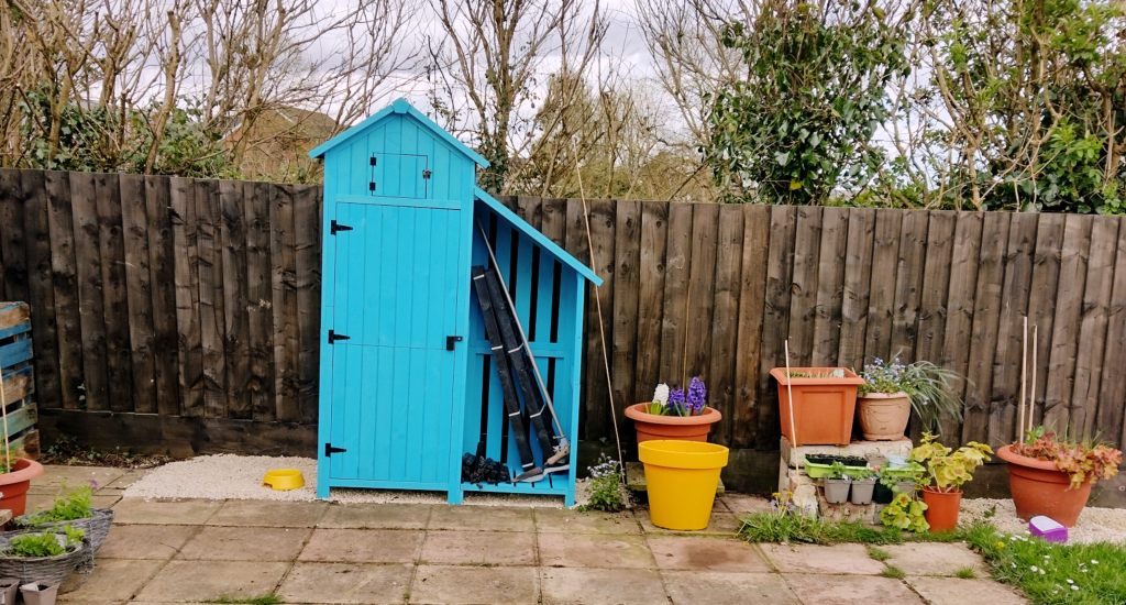 We finished the beach hut shed and cleared the space and popped down some stones.