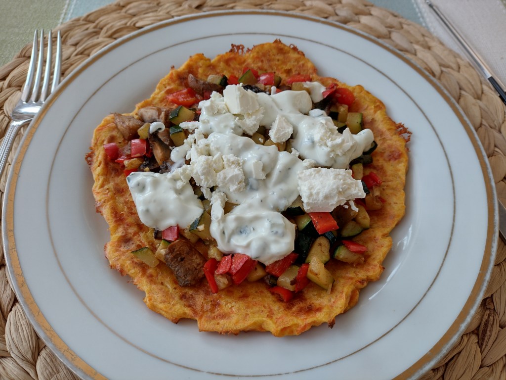 I also made a lovely veggie dish for Mia’s last night. Carrot Fajitas with Mushroom, peppers and I added courgettes too. The Carrot tortillas were made using 100g grated carrots, 1 egg, 30g grated cheese and about 2 tbsp of plain flour. Cook the carrot in a bowl with a splash of water and cover with cling film and pop in microwave for about 5 minutes. Strain through a sieve and get as much water out as you can. Then mix with rest of ingredients and spread two rounds on baking sheet that has greaseproof paper on and cook at 220° for about 10 mins.