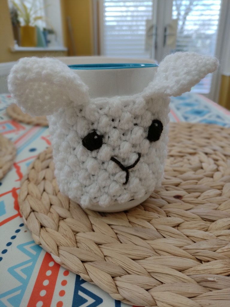 Last week I left you with a photo of the first few rows of my mug hug. So here is the finished item. I used uneven berry stitch to create the textured pattern.