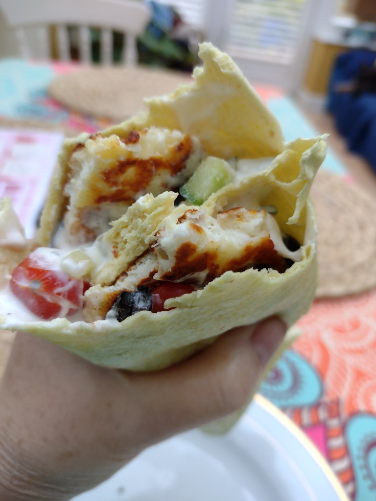 I have made a few very yummy dishes this week, most of them very simple. For lunch one day I needed a Mediterranean boost. Halloumi, tomatoes, olives all smothered with a garlicky tzatziki sauce and enclosed in a brioche wrap. Delicious 😋