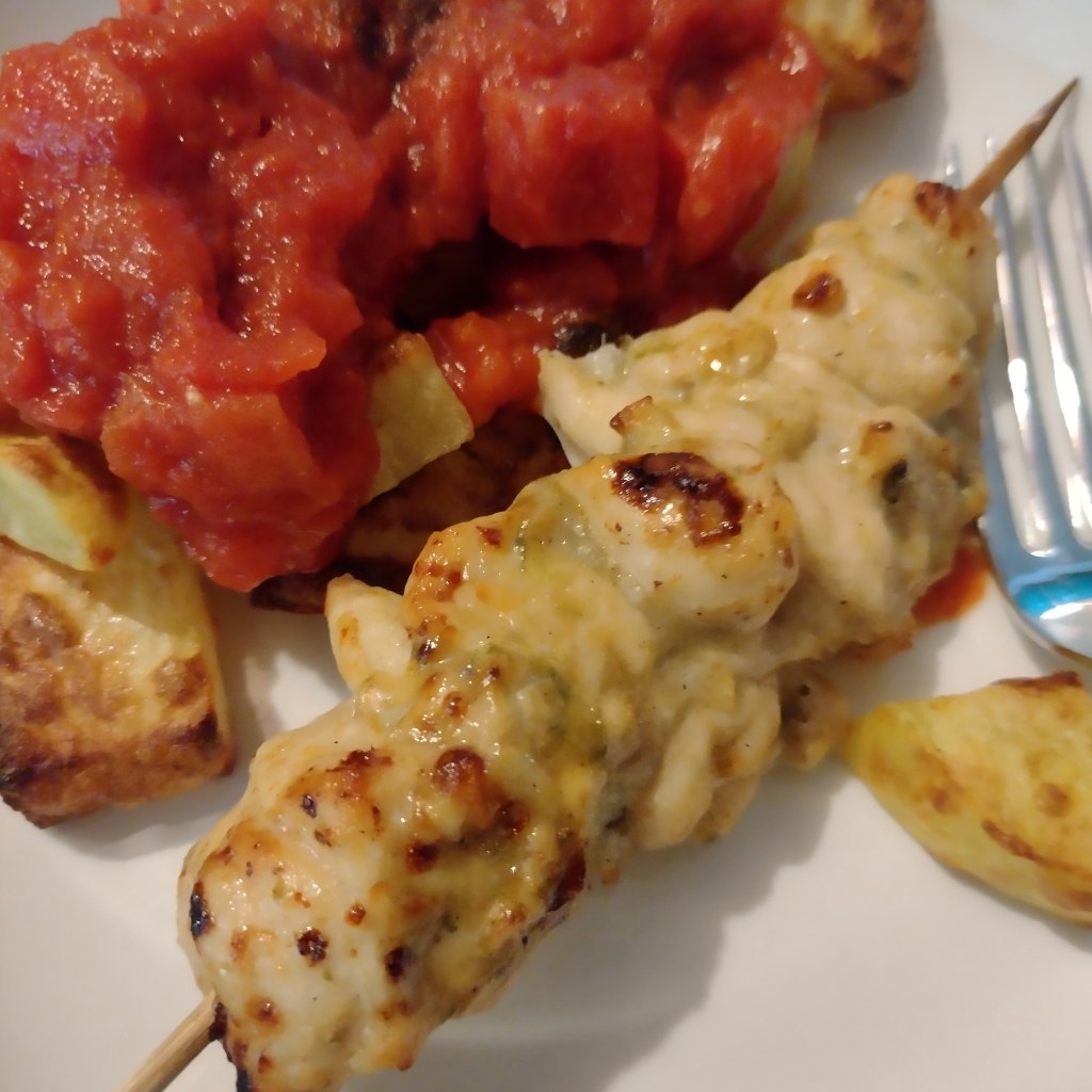 Another Mediterranean dish I made was Spanish chicken skewers and Patatas Bravas. The chicken was marinated for most of the day in olive oil, garlic, sherry and honey. I then just popped the chunks onto pre soaked wooden skewers and put in a high temperature oven for around 15-20 mins till browning.
