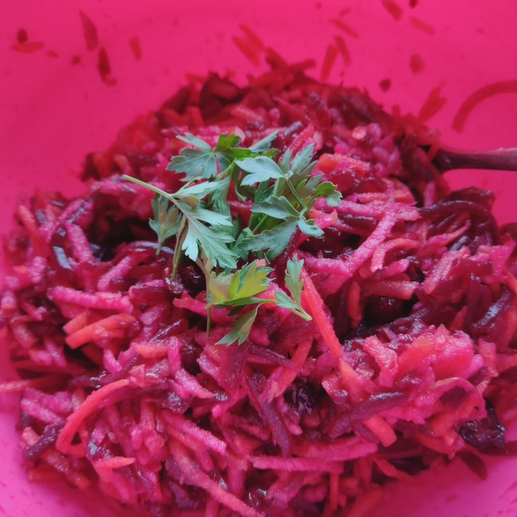 Grate the beetroot, carrots and apples and then add the cranberries.