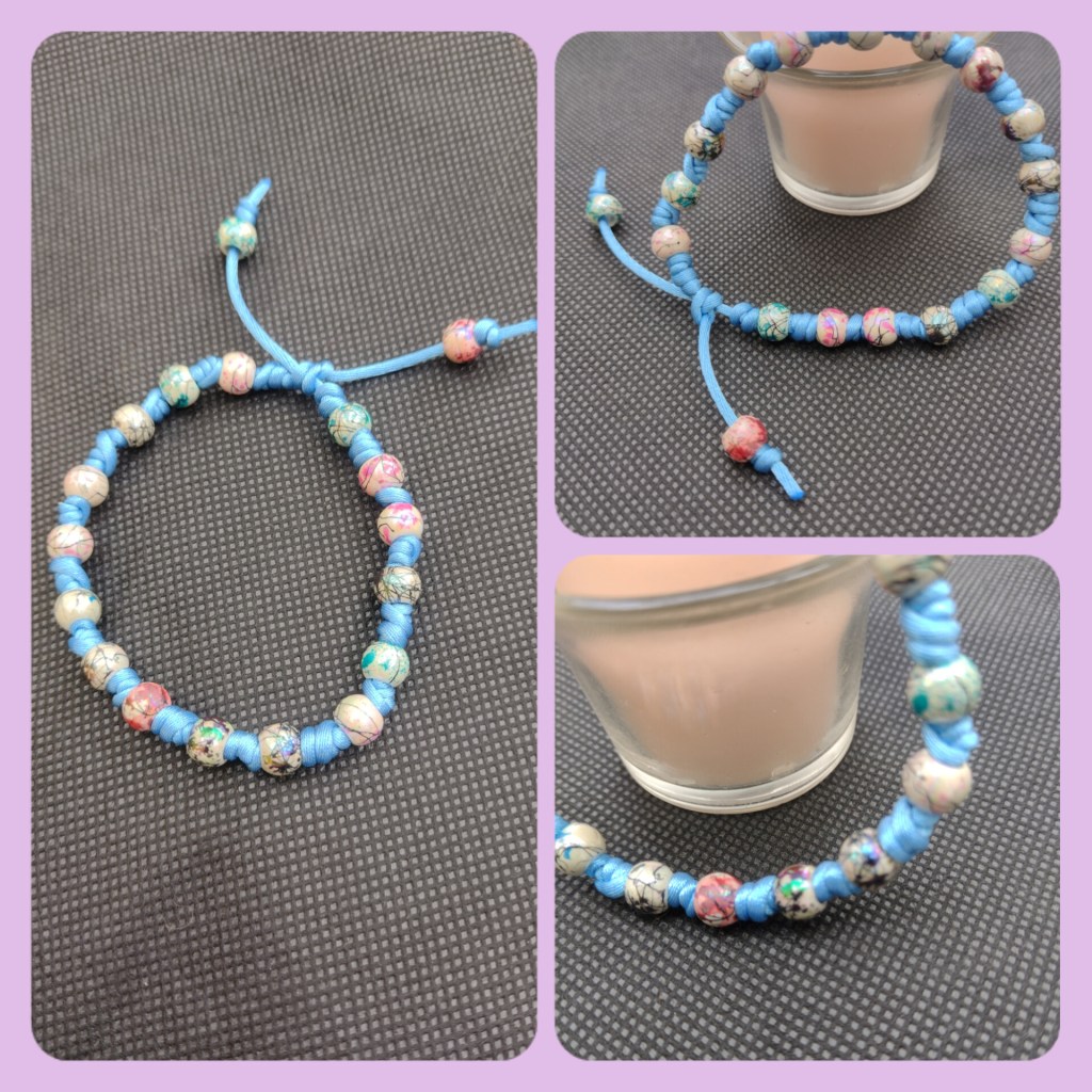 Life was not all spent in the kitchen this week and I have done a spot of crafting. I had seen a really pretty bracelet on Pinterest and really fancied trying to make something similar. I had some thin paracord and some pretty beads with a large enough hole to thread the cord through. The hardest part was making the first knot, once I worked it out the rest, as they say, was child’s play.
