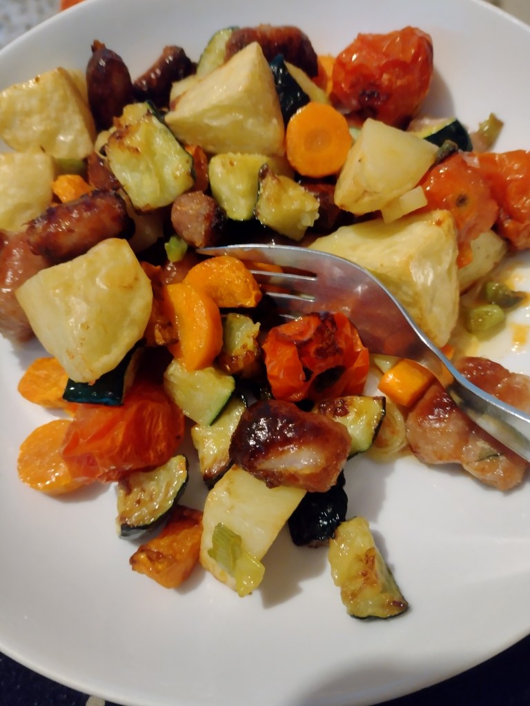 I chopped all the veg into cubes and chopped up the sausages into bite sized pieces. I used courgette, carrots, potatoes, onions and cherry tomatoes but any veg that you can roast could be used. I placed them all in a ziplock back with a little oil and salt and shook until all was coated. I then tipped into the air fryer basket and cooked at 180 degrees for 15 mins and then gave a good shake and cooked for a further 10 mins.